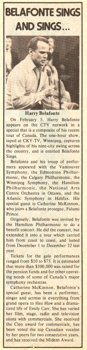 Belafonte Sings was filmed during the Winnipeg stop of the 1977 benefit tour, and shown on CTV the following February. The above are from that press kit. (collection: J. Paul)